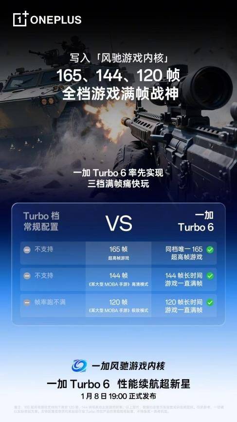 一加 Turbo 6 实现同档首发全面覆盖FPS、格斗、赛车、音游、策略、MOBA六大类手游 165 帧体验,包括《使命召唤》、《火影忍者》等主流游戏,都将支持 165Hz 超高帧模式,给用户带来前所未有的丝滑流畅体验。游戏体验上,一加 Turbo 6 更进一步,率先实现 165/144/120 三档满帧痛快畅玩,无论持久对战还是极限操作,都能为你提供稳稳的性能支撑,给予全面高帧体验。 同时,据官方数据显示,一加 Turbo 6 支持《王者荣耀》在144 帧+高清模式下,运行3小时的平均帧率达143.9帧,是同档唯一实现《王者荣耀》144帧全程满帧的机型。