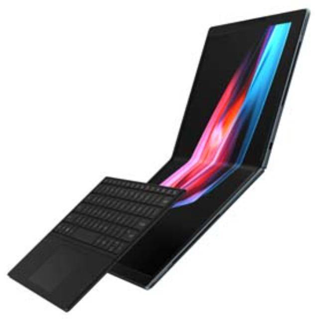 键盘可以安装在折叠处,也可以覆盖折叠处下方一半的屏幕,以获得双屏笔记本电脑体验。如果需要更多工作空间,它可以放置在 17 英寸宽屏桌面上,并通过无线键盘使用。