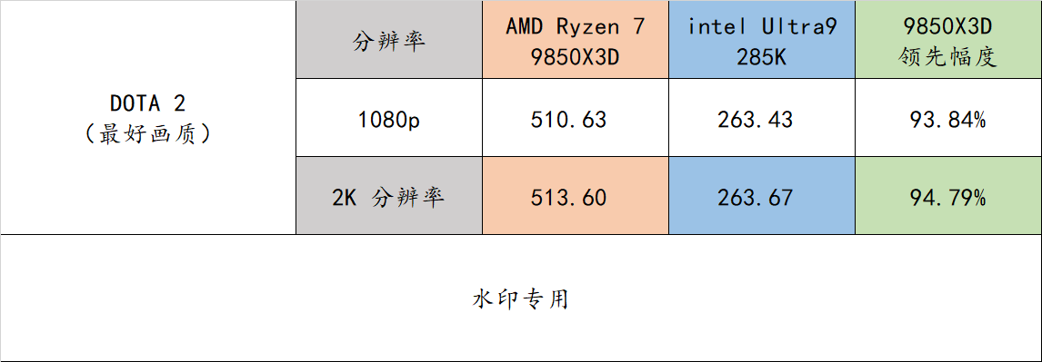 ▲ 《DOTA 2》游戏实测,《DOTA 2》这款游戏很有趣,在显卡性能足够的情况下,分辨率越高,性能越强。之前 9800X3D 就是比赛指定 CPU,作为更强的 9850X3D,游戏表现更强。