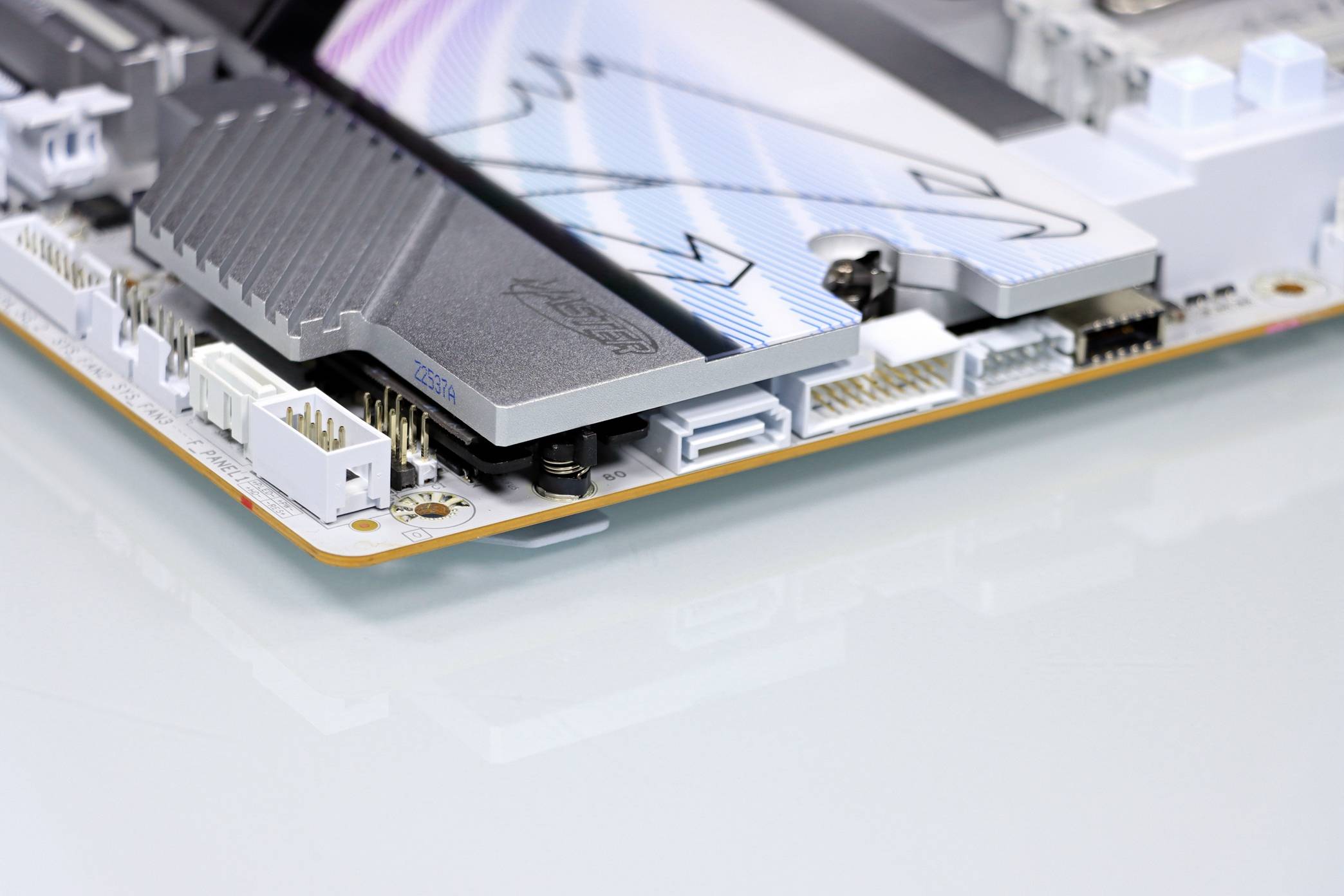 ▲ VRM 散热模块与 CPU 直连的 M.2 PCIe 5.0 X4 SSD 散热模块都非常厚实,可以最大化利用机箱的风道进行散热,让整机运行更稳定。