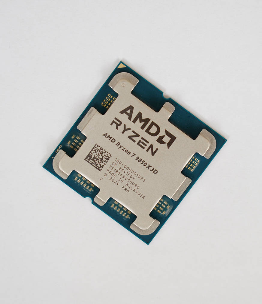 ▲ AMD Ryzen 7 9850X3D 正面照,9850X3D 本质上是 9800X3D 的工艺稳定后的迭代升级优化版本,拥有更高的动态加速频率,其他参数与 9800X3D 一致,这也让 9850X3D 除了性能更强外,也保持了 9800X3D 高能效比高兼容等其他优点!