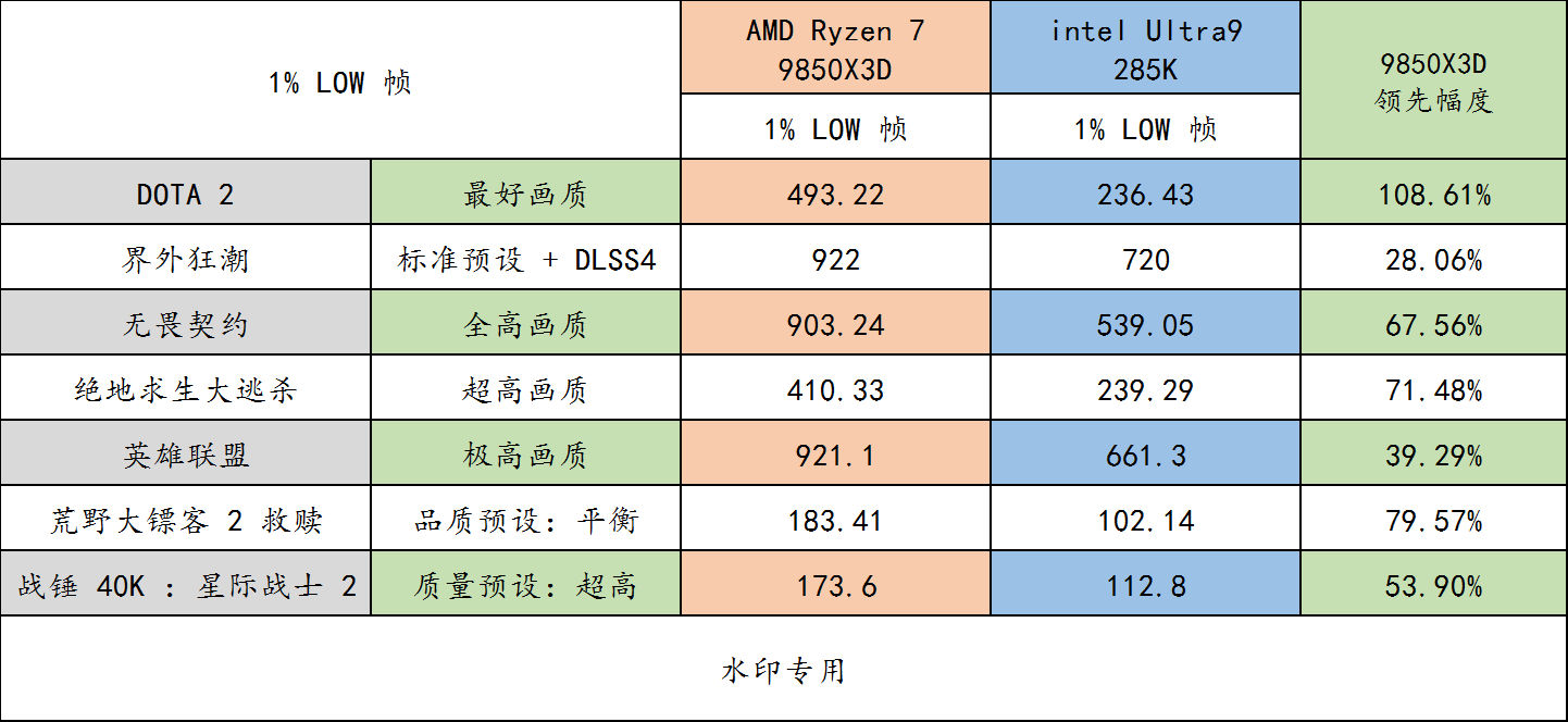 ▲ 作为 9800X3D 的 Plus 版本,9850X3D 因为拥有更强的动态加速频率,所以理论上 9850X3D 的 1% LOW 帧表现会更强!领先幅度基本上比游戏的平均值领先还高。