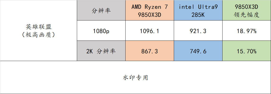 ▲ 《英雄联盟》LOL 游戏实测,采用训练模式中路破三塔之间测试过程中的平均录像,记录下来并求取平均帧以及 1% LOW 帧。作为之前商业化最成功的电竞联赛,9800X3D 的表现已经深受认可,更强的 9850X3D 将会给赛事带来更强的游戏流畅度表现。