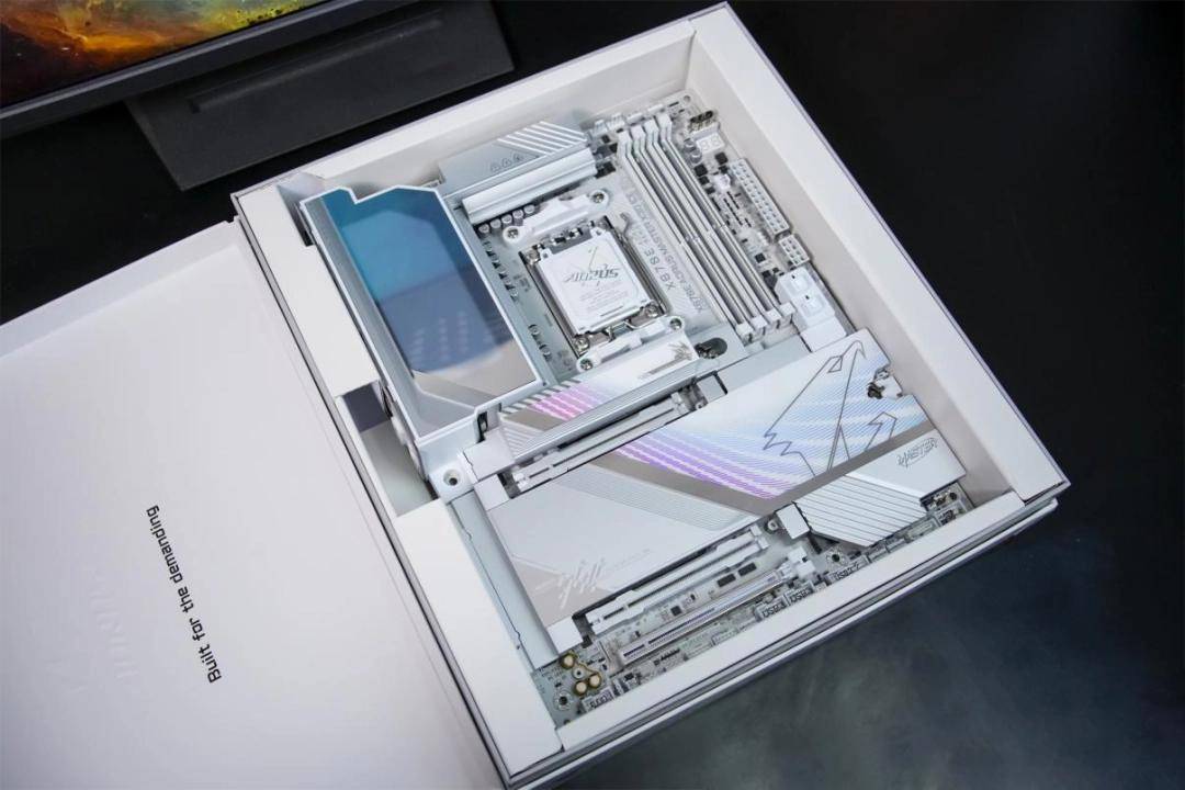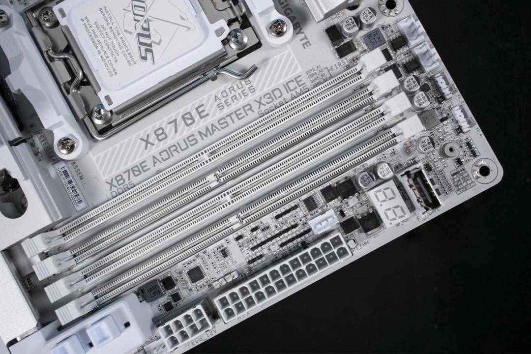 技嘉X870E AORUS Master X3D ICE是一块专为AMD的X3D系列处理器打造的高端主板。整体配色采用从底层纯白向上层银白色金属过渡的多层设计,搭配I/O区域的AORUS灯光和散热装甲上的冰雕标志,点亮后既有高颜值也有极强的辨识度。