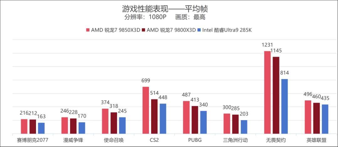 进入到游戏实测环节,我们这次一共挑选了8款当下主流游戏进行测试,涵盖了单机3A大作和多款主要考验CPU性能的FPS网游,所有游戏统一在1080P分辨率最高画质下运行,关闭光线追踪和帧生成功能。除了用前面提到的Intel酷睿Ultra9 285K做对比外,我们还加入了与兄弟产品AMD锐龙7 9800X3D的对比,尽可能直观地展现新老两款CPU之间的性能提升。