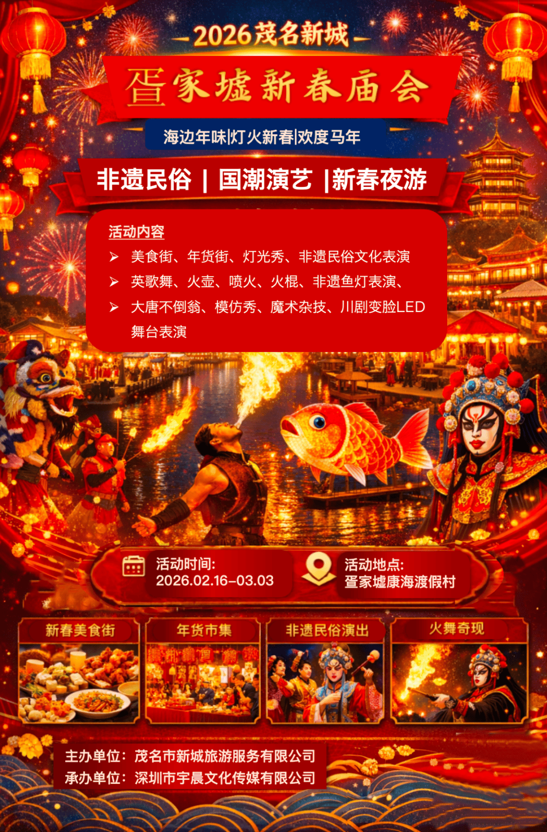 活动内容:以电白区丰富多彩的非物质文化遗产为载体,通过传统技艺展示、民俗表演巡游、非遗美食体验等多元形式,打造一场沉浸式、互动性的新春文化狂欢。