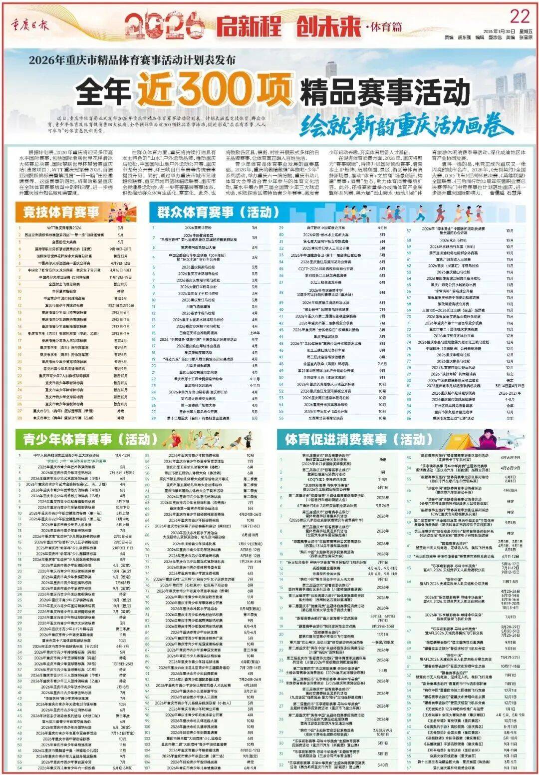 在促进体育消费方面,2026年,重庆将聚力“赛事赋能”,持续升级国际顶级赛事、培育本土IP矩阵,拓展商圈、景区、街区等体育消费新场景,推动“体育+文旅商”场景创新,构建“赛事+消费”生态,助力体育消费提质扩容。此外,还将高质量举办成渝体育产业联盟杯系列赛、第六届“巴山蜀水·运动川渝”体育旅游休闲消费季等活动,深化成渝地区体育产业协同发展。