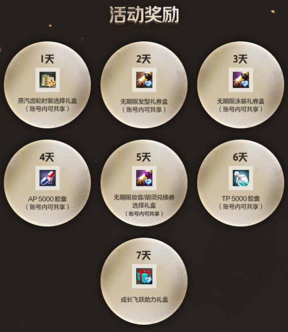 签到活动也会同步开启,每日在线分钟,即可获得签到奖励,其中包括S级时装蒸汽齿轮时装选择礼盒、无期限发型/泳装礼券盒、成长飞跃助力礼盒等。