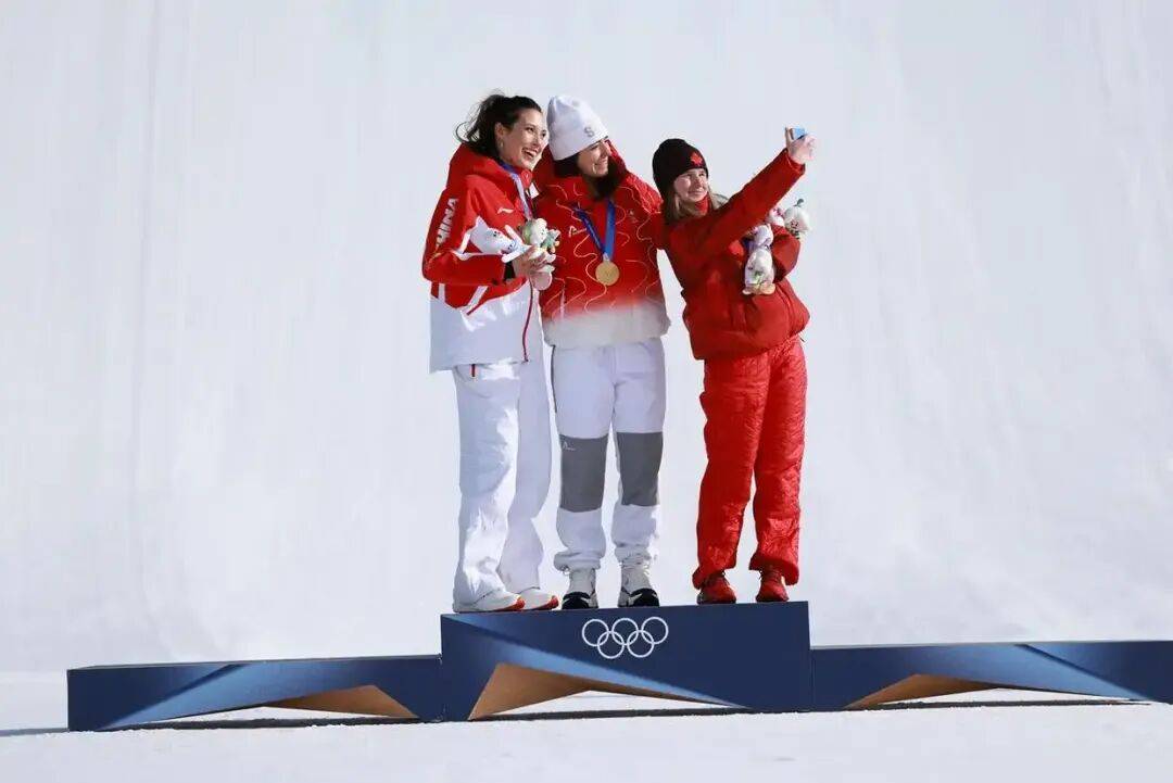 ▲谷爱凌(图左)凭借第一轮比赛获得的86.58分摘得银牌,北京冬奥会该项目冠军、瑞士选手玛蒂尔德·格雷莫德(图中)在第二轮得到86.96分,以0.38分的微弱优势获得金牌,加拿大选手梅甘·奥尔德姆(图右)获得铜牌。图源:工人日报
